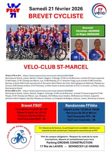 Le Vélo Club Saint Marcel organise le Samedi 21 Février 2026, le Brevet de Saint Marcel, Souvenir Christian Jeannin et Régis Bernard. 2 sorties sont au programme: 79 et 52 km. Tous les détails des parcours et horaires ici.