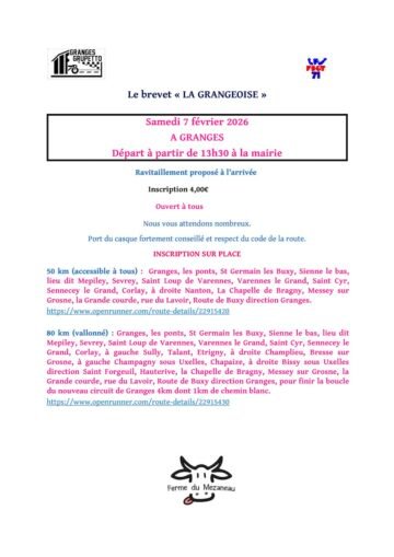 Granges Grupetto organise le Samedi 7 Février 2026, le Brevet « la Grangeoise » à Granges. 2 sorties sont au programme: 80 et 50 km. Tous les détails des parcours et horaires ici.