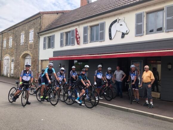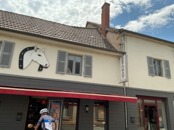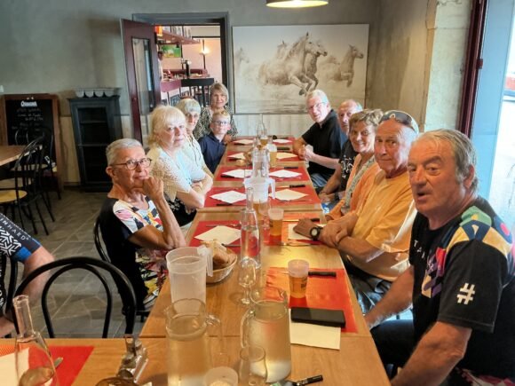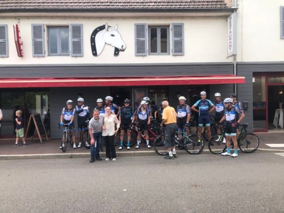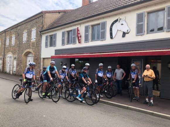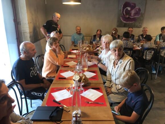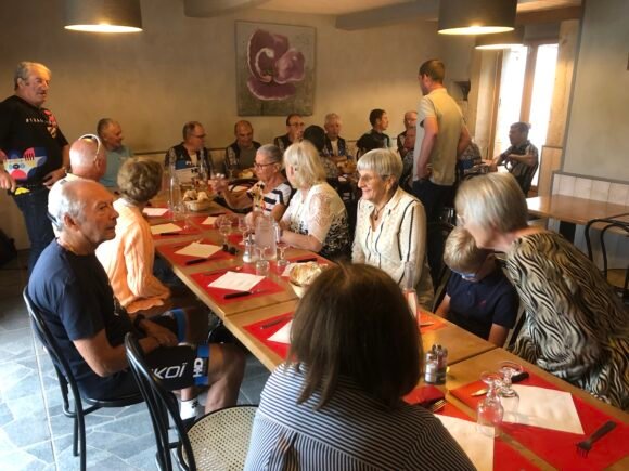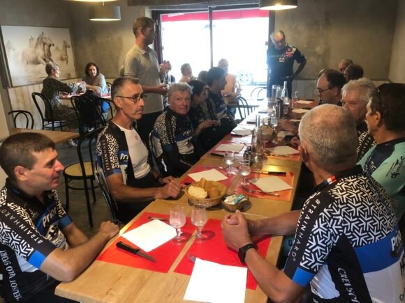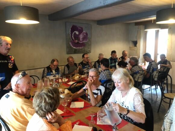 A 13 heures, après les 118 kms de la première partie du parcours, c’est la pause déjeuner au Restaurant « Le Cheval Blanc » à la Clayette où certaines épouses ont rejoint le groupe pour apprécier le repas sportif concocté pour les 22 convives par le couple de restaurateurs Alexia et Antoine. (Cela a évité le fameux repas tiré du sac)