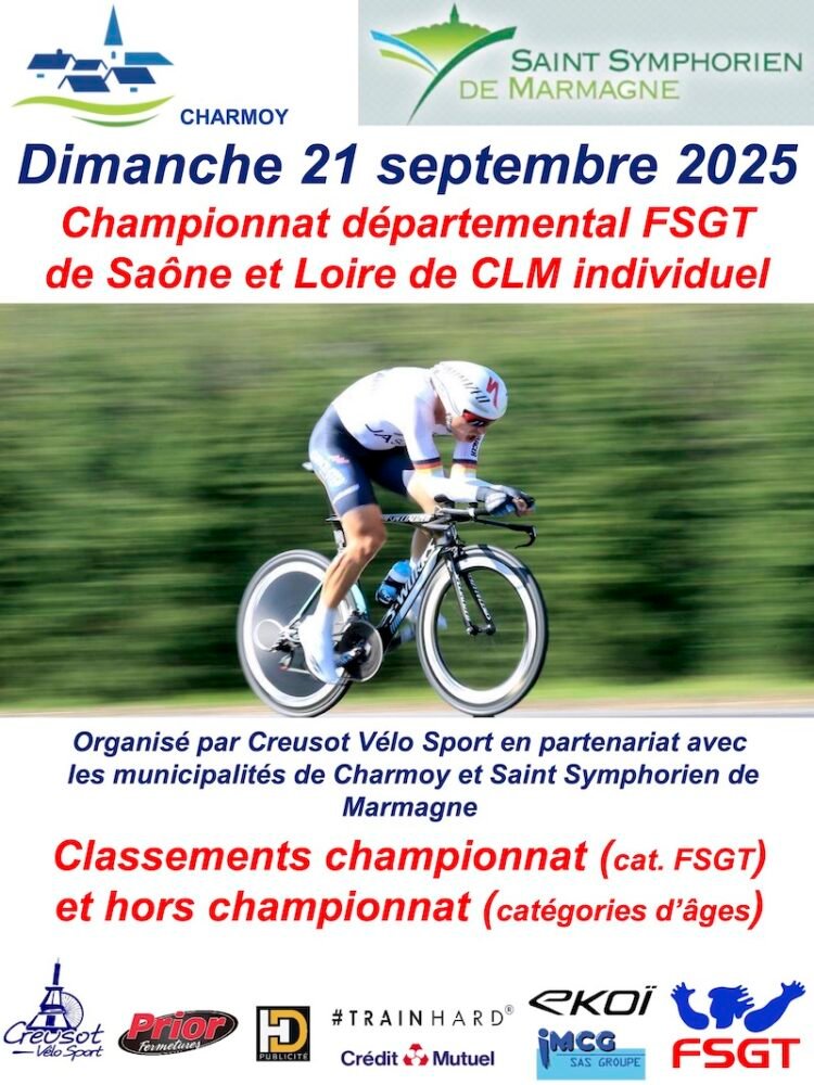 Nous organisons le Dimanche 21 Septembre 2025, le Championnat départemental FSGT de Saône & Loire de CLM individuel entre Charmoy et Saint Symphorien de Marmagne (dans la Vallée de la Brume). Tous les détails de cette organisation sont ici.