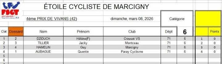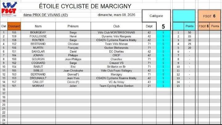 Dimanche 8 Mars 2026, le Prix de Vivans (42), organisation de l’Étoile Cycliste de Marcigny, a rassemblé une centaine de concurrents dont 3 adhérents de Creusot Vélo Sport.