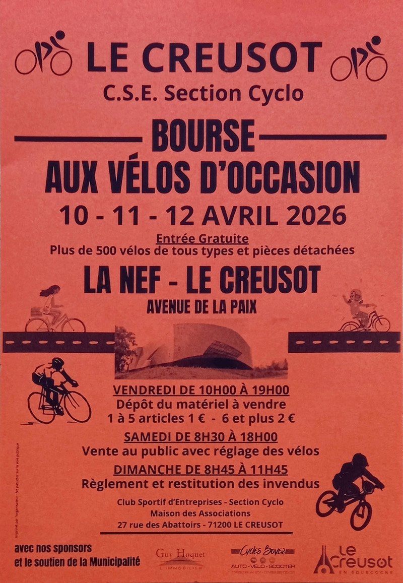 Nos amis du CSE Cyclo organise les 10, 11 & 12 Avril 2026, la Bourse aux vélos d’occasion, à la Nef au Creusot. L’entrée est gratuite. Tous les détails de cette manifestation sur l’affiche ci-dessus.