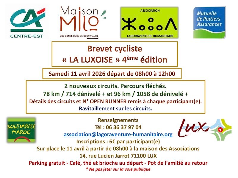 La 4ème édition du Brevet cycliste « La Luxoise » aura lieu le Samedi 11 Avril 2026 à Lux. Les départs sont possibles de 8h à 12h, sur 2 parcours route (78 et 96 km). Avis aux amateurs…