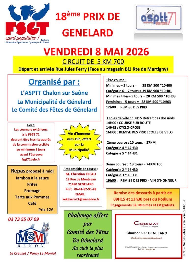L’ASPTT Chalon organise le Vendredi 8 Mai 2026, la 18ème édition du Prix de Génelard FSGT, sur un circuit de 5,7 km. Retrouvrez la Plaquette officielle de l’épreuve.