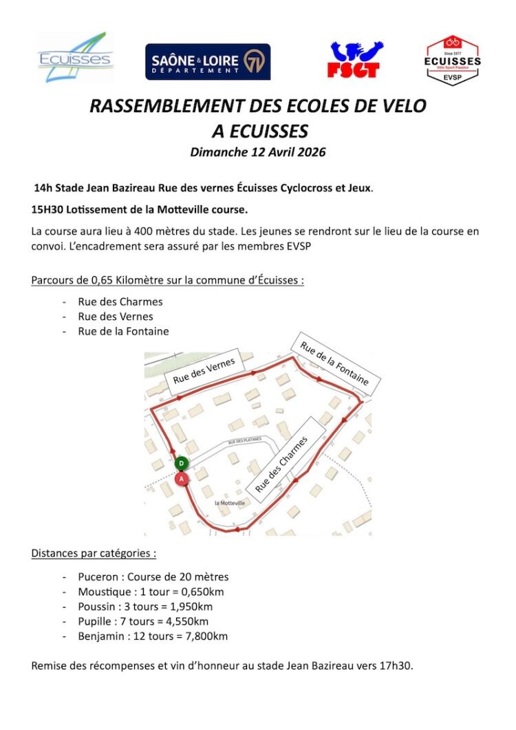 Nos amis d’Ecuisses Vélo Sport Passion organise ce Dimanche 12 Avril 2026, le Rassemblement des Ecoles de Vélo à Ecuisses, de Pucerons à Benjamins.